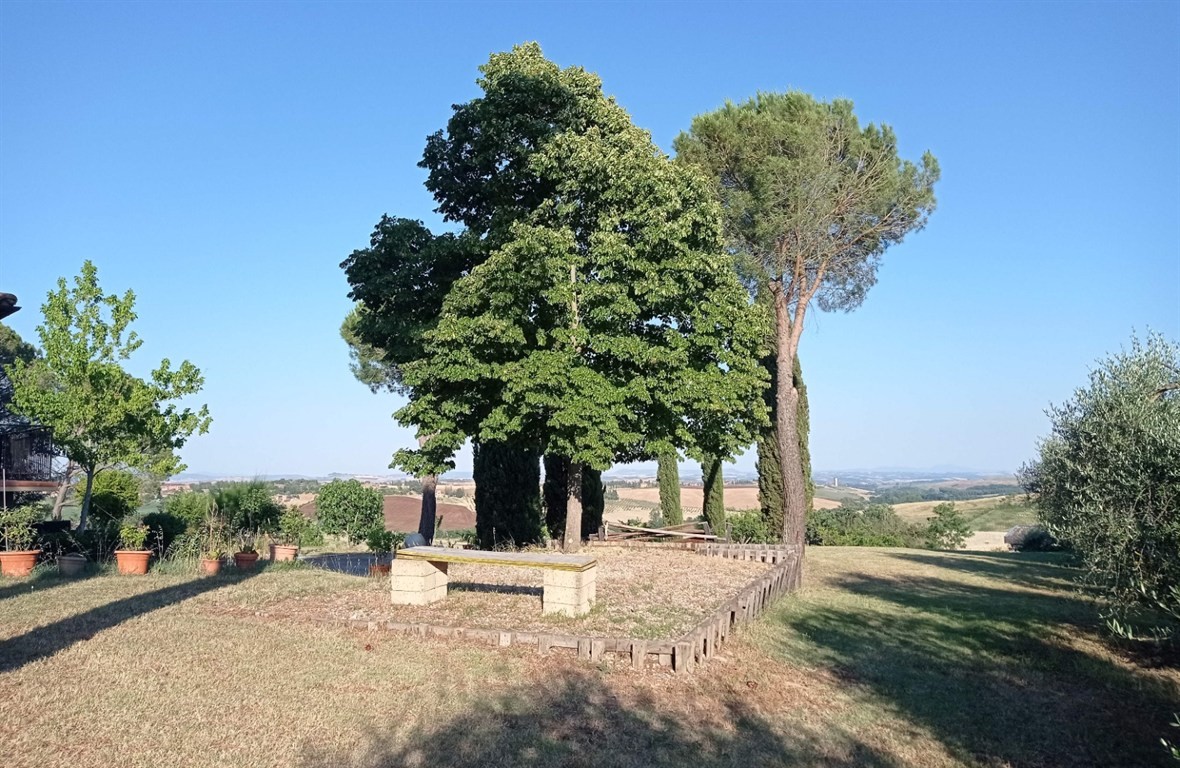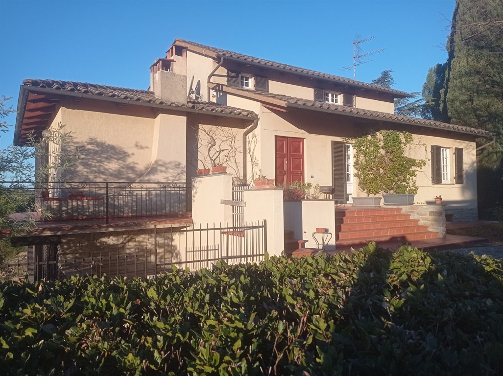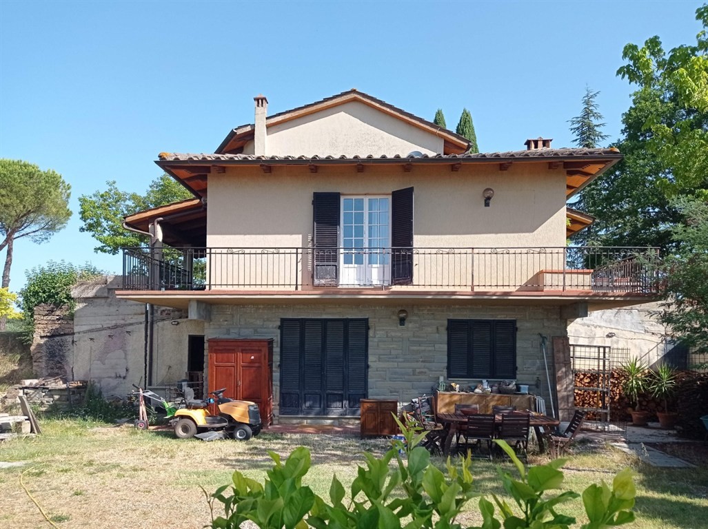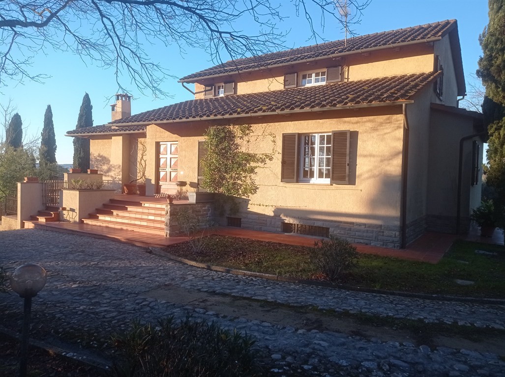 SIENA, IMMEDIATE VICINANZE DELLA CITTA'. Vendesi a soli 4 km dal centro storico, villetta unifamiliare di mq 400 circa, situata su un crinale che gode di una bellissima veduta panoramica verso la città, in posizione riservata. La villa, realizzata intorno alla fine degli anni Settanta è disposta su tre livelli; al piano seminterrato (160 mq circa) troviamo degli ampi e gradevoli locali accessori con camino (ideali per condividere momenti conviviali o come spazi accessori quali studio/hobbistica), un bagno, vano lavanderia, ripostiglio e cantina; il piano terra (160 mq circa) ha accesso ad un grande porticato ed è composto da ingresso, cucina a vista, sala pranzo-tv, due camere matrimoniali e doppi servizi: il piano primo (75 mq circa) si compone di un'ulteriore camera matrimoniale con terrazzo, ampio guardaroba, disimpegno/ salottino due vani ripostiglio e bagno. La villa gode di privacy , essendo circondata da 8.500 mq di giardino recintato (con vari alberi da frutto e 30 olivi) all'interno del quale insiste un volume accessorio adibito a magazzino per ulteriori mq 40. E' inoltre presente un fontone a cielo aperto per la raccolta della acque meteoriche per l'irrigazione di siepi, fioriere ed arbusti disposti lungo i vari percorsi e terrazzamenti ornamentali, provvisti di impianti goccia-a-goccia. La proprietà offre interessanti possibilità di sviluppo e riqualificazione