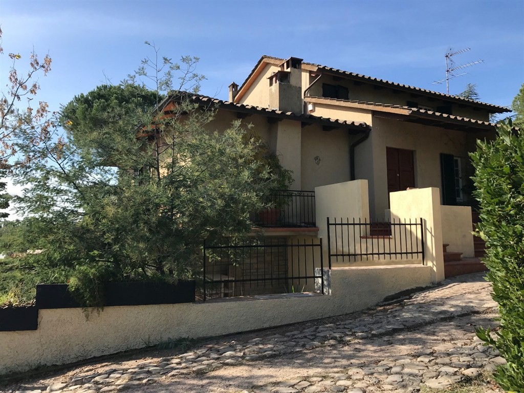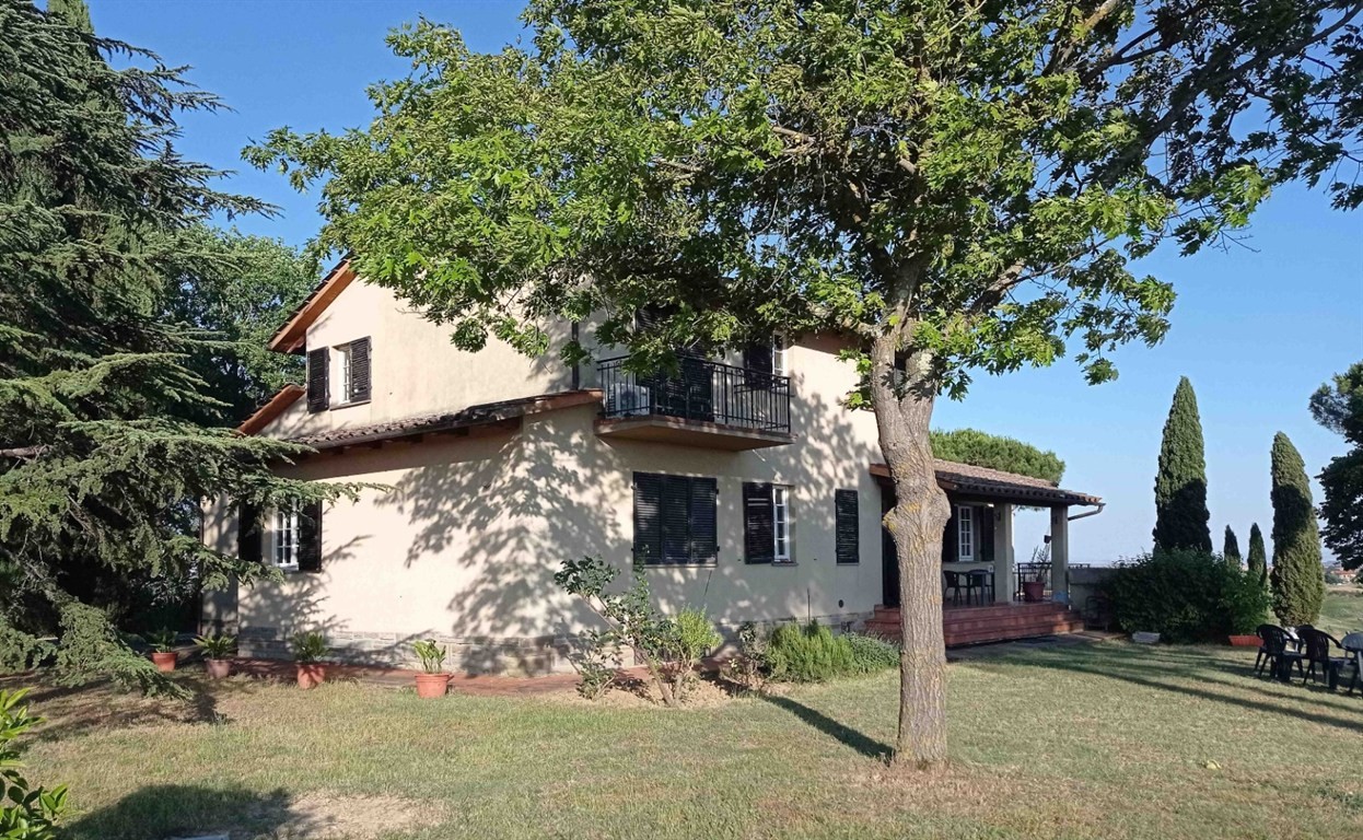 SIENA, IMMEDIATE VICINANZE DELLA CITTA'. Vendesi a soli 4 km dal centro storico, villetta unifamiliare di mq 400 circa, situata su un crinale che gode di una bellissima veduta panoramica verso la città, in posizione riservata. La villa, realizzata intorno alla fine degli anni Settanta è disposta su tre livelli; al piano seminterrato (160 mq circa) troviamo degli ampi e gradevoli locali accessori con camino (ideali per condividere momenti conviviali o come spazi accessori quali studio/hobbistica), un bagno, vano lavanderia, ripostiglio e cantina; il piano terra (160 mq circa) ha accesso ad un grande porticato ed è composto da ingresso, cucina a vista, sala pranzo-tv, due camere matrimoniali e doppi servizi: il piano primo (75 mq circa) si compone di un'ulteriore camera matrimoniale con terrazzo, ampio guardaroba, disimpegno/ salottino due vani ripostiglio e bagno. La villa gode di privacy , essendo circondata da 8.500 mq di giardino recintato (con vari alberi da frutto e 30 olivi) all'interno del quale insiste un volume accessorio adibito a magazzino per ulteriori mq 40. E' inoltre presente un fontone a cielo aperto per la raccolta della acque meteoriche per l'irrigazione di siepi, fioriere ed arbusti disposti lungo i vari percorsi e terrazzamenti ornamentali, provvisti di impianti goccia-a-goccia. La proprietà offre interessanti possibilità di sviluppo e riqualificazione
