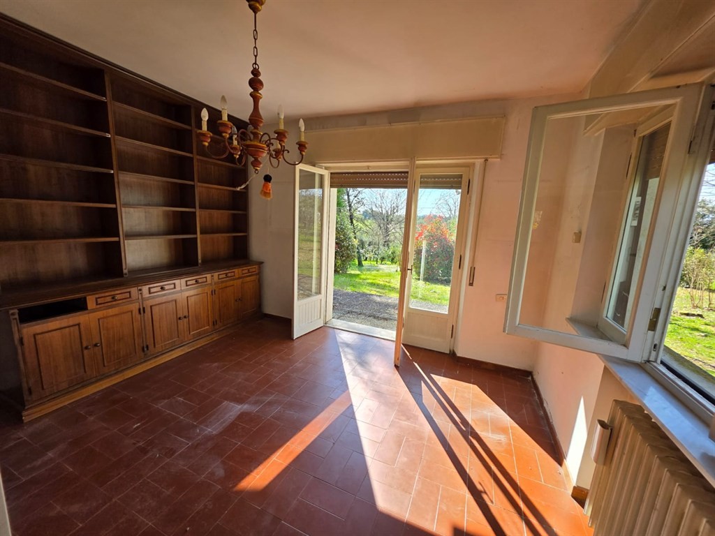 Gli interni conservano elementi di grande charme come parquet, camini e ampie vetrate che incorniciano il verde circostante, creando un dialogo continuo tra interno ed esterno.